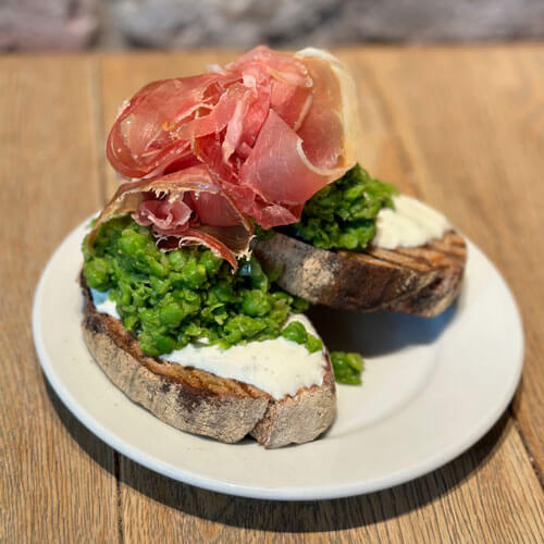 グリーンピース、バジル、プロシュート、フロマージュブラン